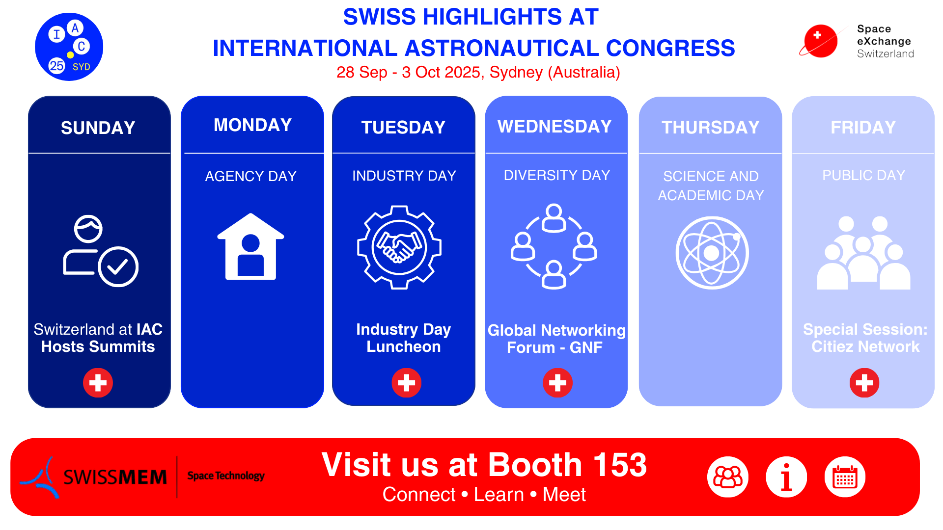 Space Exchange Switzerland is excited to announce that we will be attending the International Astronautical Congress (IAC) 2025 in Sydney with a small national booth. This will be a great opportunity to showcase Switzerland’s presence in the global space community, and connect with partners from around the world.